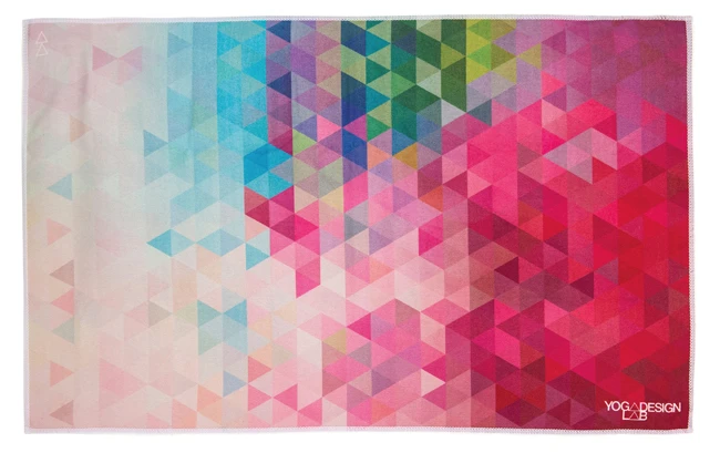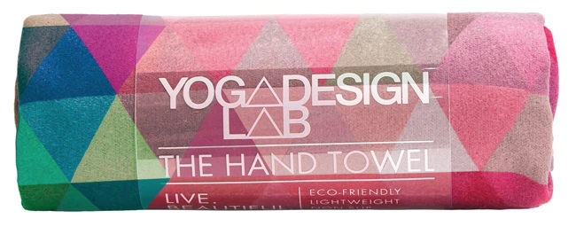 Dette lille håndklæde fra Yoga Design Lab er fremstillet af genanvendte plastflasker og trykt med vandbaserede trykfarver.