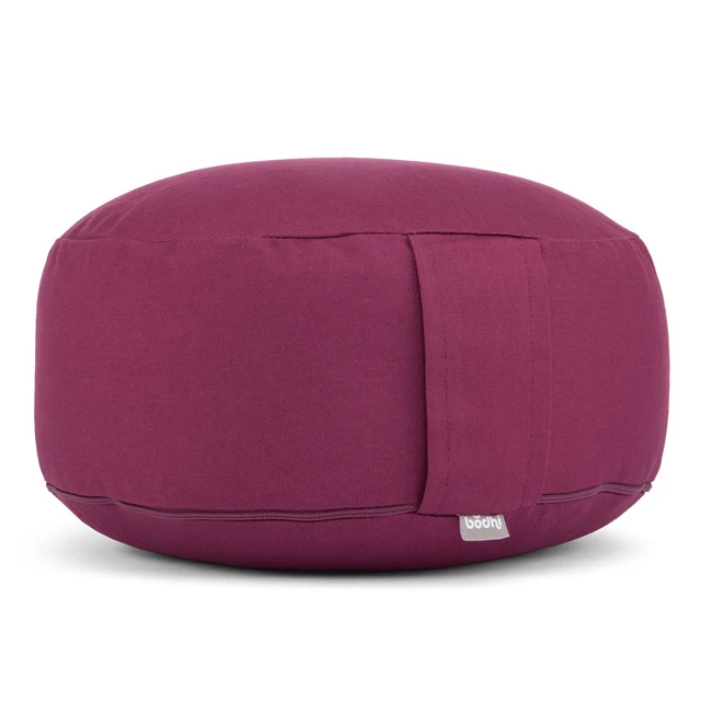 Rund meditationspude med aftageligt betræk. Det ydre betræk har et praktisk håndtag til. Speltskallerne i puden tilpasser sig godt til kroppen. Højden på puden kan let justeres ved at fjerne noget af fyldet.