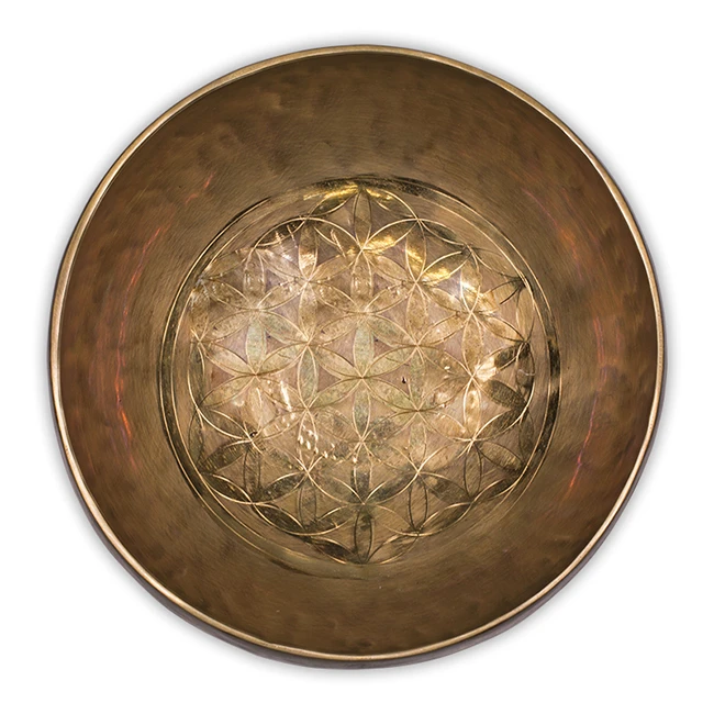 Syngeskål med indgraveret mandala (livets blomst) og buddhistiske ornamenter.
