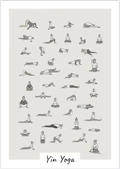 Plakat med de 43 Yin Yoga stillinger fra bogen Yin Yoga – stræk dig til velvære – vol. 3