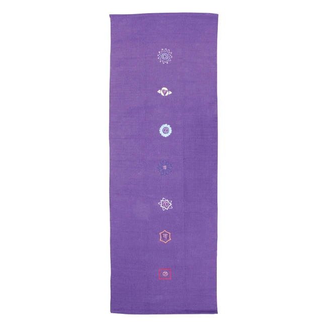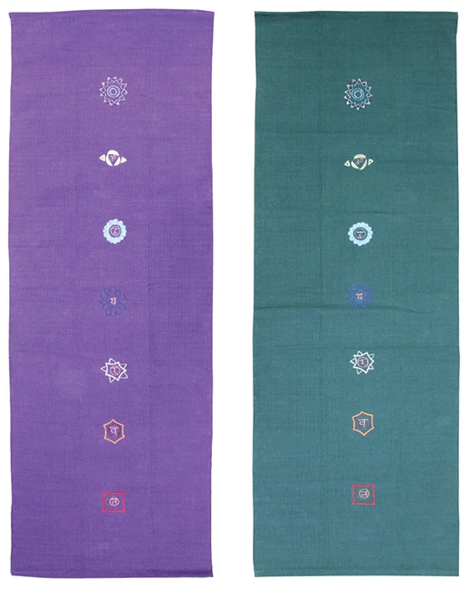 Yogamåtten er broderet med de syv chakraer, som kan hjælpe dig i de stående stillinger og til at holde dig fokuseret på at være: